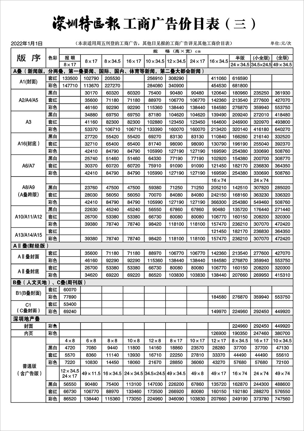 深圳特區(qū)報(bào)工商廣告價(jià)目表