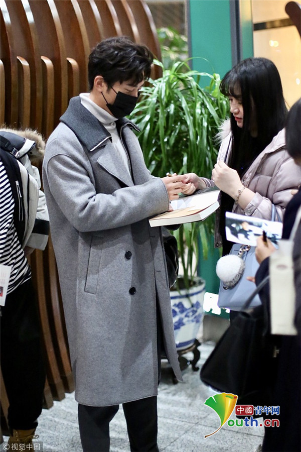 ??2017年12月13日,北京,竇驍身著灰色大衣、戴口罩現(xiàn)身機場,為粉絲大方簽名,見鏡頭開心比V揮手親和力滿分。