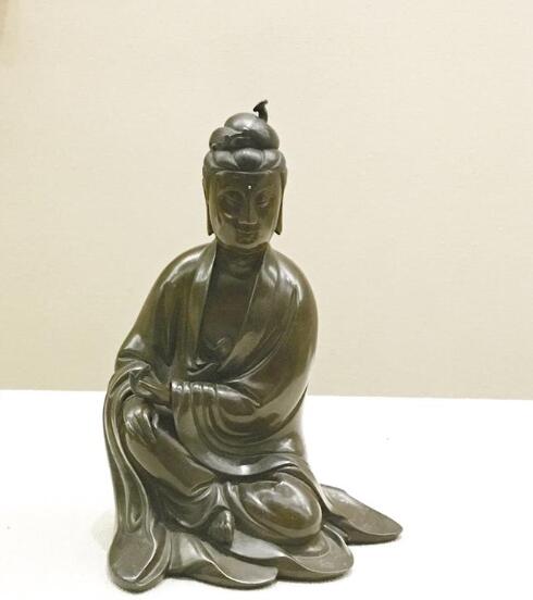 其中,最引人注目的莫過于展覽海報上呈現(xiàn)的“景德鎮(zhèn)白釉瓷塑觀音菩薩像”,產(chǎn)于南宋時期,整尊瓷塑構(gòu)思既簡約又精巧,以粗線條捏塑形體與衣紋,胸前瓔珞精致,人物形象傳神,充分展現(xiàn)了宋代瓷塑藝術(shù)的審美意韻與高超技藝。令人嘖嘖稱贊的還有明中晚期的“銅觀音菩薩像”。此像采用暹羅國(今泰國)所貢優(yōu)質(zhì)風磨銅鑄造,工藝精細,撫之如嬰兒肌膚,嵌銀絲,背后銀絲鑲嵌方章銘款“石叟”二字,當出自石叟本人之手。據(jù)了解,石叟為明代晚期鑄銅塑像名匠,僧人身份,現(xiàn)存中晚明觀音銅像中尚有部分“石叟”款,真品珍貴稀罕。