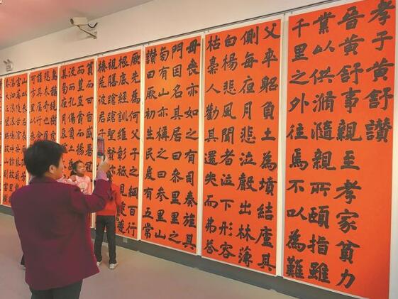 據了解,此次展覽不同于普通的書法展,而是以“孝德”為內容的主題創(chuàng)作展,所有作品都圍繞孝文化進行創(chuàng)作,每一幅作品都在講述一個關于孝文化的故事。在“孝德”大主題下,又分了幾個小專題,比如“二十四孝專題”“孝經專題”“金石題跋專題”,還有本土的“孝德寶安專題”。當天的展覽吸引了大量觀眾,不少觀眾還帶著小孩參觀,黃女士告訴記者,“今天帶著小孩來,一是欣賞書法,二是希望小孩了解一下傳統的孝德文化,我們通過書法還了解到寶安孝子黃舒的故事?!?/p>