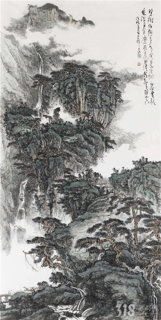 我以為,范陽先生是真正在心性上貼近古人“不下堂筵,坐窮泉壑”,其現(xiàn)居贛中名岳武功山、楊岐山之中。尤其武功山,史上與衡山、廬山并稱江南三大名山,被冠以“衡首廬尾武功中”,山脈綿延浩瀚,茫茫無際。范陽先生終日面山臨壑,弄筆自適,得武功真容。山水畫從來就不是簡單的描摹自然的風(fēng)光,無論丘園養(yǎng)素還是泉石嘯傲,都是畫者精神的自然流露,這是畫家筆墨情態(tài)的表達,亦是畫家藝術(shù)境界追求的體現(xiàn)。對于山林的描繪,承載了畫者對泉石意趣的向往,對于林下境界的追求。范陽先生的山水畫作品長于布景,對山中的“陰、晴、朝、夕”的細膩描繪都有他自已獨特感悟和表達。筆下極丘壑浩渺之勢,奇峰羅列,宛有風(fēng)骨,深壑幽谷,其勢超峻;至于松柏掩映,峭壁涌泉,野道幽麓,于野逸之態(tài)甚備。范陽先生數(shù)十年來遍臨南北宗諸家,遠溯元人四家,清初四王,近至黃秋園,上下求索,崇穆有加,最終歸皈真逸正脈。新近年逾七十之作,日漸精熟,蒼腴古厚,更趨融古化古之態(tài),細究其筆下蹤跡:子久?麓臺?秋園?各不相肖,而莫不精備。諦觀其中景象:匡廬?武功?羅霄?渾然而化,不一而足。如此境地當(dāng)稱“妙解”。