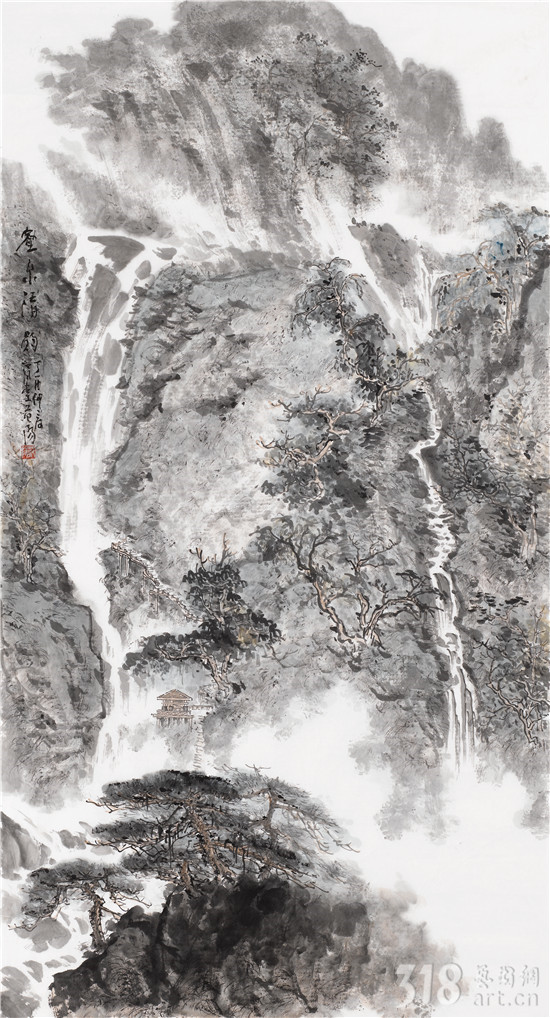山水之所以成為中國繪畫的永恒主題,跨越時空,也在于“自然”這一永恒主題是人類心中的凈土。與卡拉揚所說的以巴赫音樂“校正視聽”同出一轍,山水藝術(shù)家籍借山水畫,作為修煉自我的一條途徑。與音樂一樣,山水畫既有抽理的邏輯,又有造化的邏輯。師造化能有溫度,抽理能讓我們的心靈得到升華與純凈,我們的手、眼、心在師造化和抽理中,最后達到師物游心、物我兩忘之境。范陽先生終年隱居江西武功山和楊岐山,師造化使他筆下的丘壑、林泉、松石,高曠而有真意,不落程式窠臼。早年潛心古法研究,謙遜問學(xué),轉(zhuǎn)益多師。門庭既闊,筆墨則不得不精,眼界既寬,格調(diào)則不得不高。近年的作品,更從早年的細膩綿密,化而為奔放渾厚。其畫不論大作或小品,首取氣韻,不營營于一草一木,放逸中卻又能見綿密細致。又以草情筆法入畫,于平直處流露其錚錚骨骼及磊磊性情,飛動處可見其心瀾翻動,觀其作,可想見其作畫時心手雙暢之態(tài),如汩汩之泉,一瀉千里而不得止,非長年積養(yǎng)之功不可得哉。