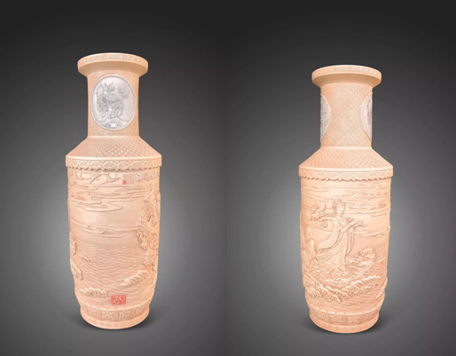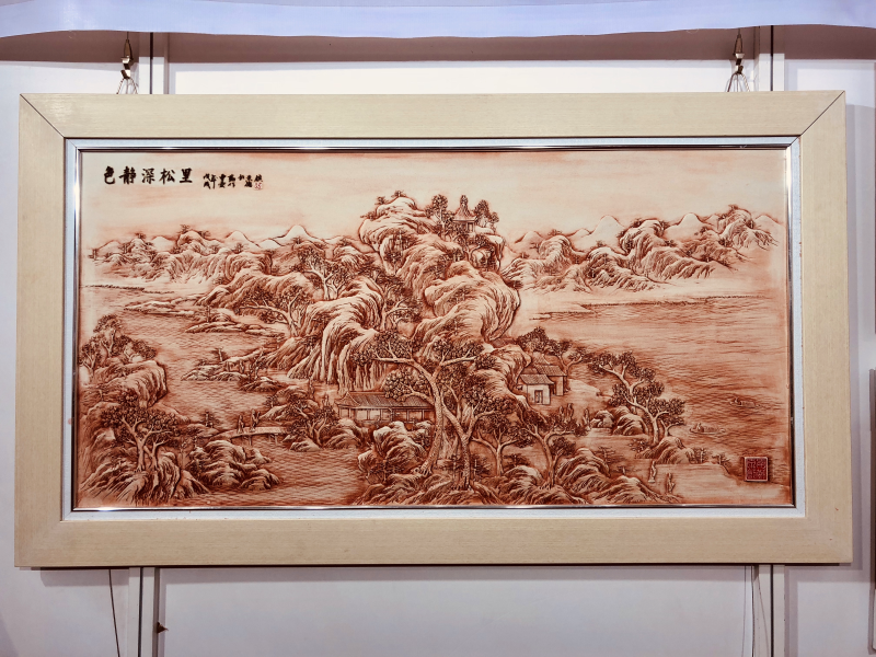 這是曹愛勤首次參加深圳文博會,帶來了她所創(chuàng)作的陶瓷、篆刻、書畫等多種形式的藝術作品,可以看到其不同形式作品的創(chuàng)作技法、主題、表現(xiàn)手法等均有較大差異,充分體現(xiàn)了曹愛勤在陶瓷藝術道路上追求卓越、勇于創(chuàng)新的新時代大國工匠精神。在其創(chuàng)作中,特別是作為中國陶瓷重要組成部分的陶瓷雕刻作品《色靜深松里》、《八仙過?!?,承載了國畫、雕刻、裝飾等綜合性藝術手法,每件作品都充分體現(xiàn)出工匠技能,堪稱學貫中西、熔鑄古今之珍品。