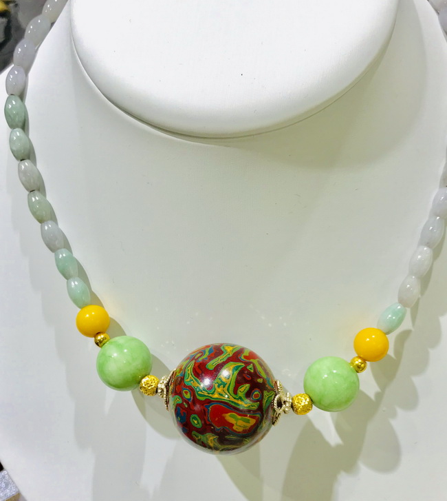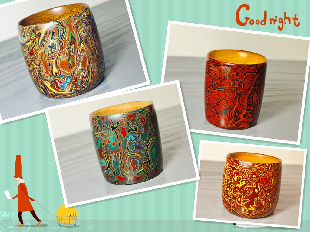 浙江省組團的展位在會展中心2號館,規(guī)模不小,羅獻兵老師的漆藝作品都比較精致,但展位卻比較舒展。一眼望去,五彩斑斕的漆藝作品令人眼花繚亂,精神為之一震,主要作品有犀皮漆扇、印盒、糖果盒、竹胎茶杯、腰墜以及手串和漆珠等。前來參觀的人不少,但從他們的言談中得知了解的并不多,多為其絢麗的光彩所吸引。