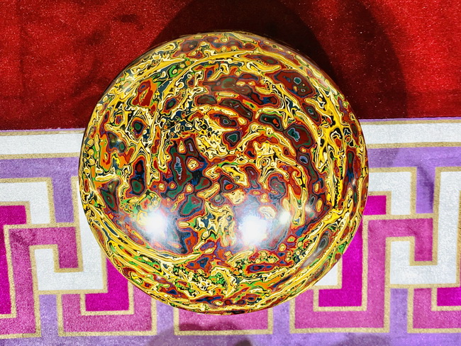 犀皮漆,又稱犀皮、西皮、虎皮漆,此技法起于唐朝,在宋朝時十分流行。羅氏犀皮漆器是我國古代數(shù)百種髹飾漆藝中獨具特色的一種,是傳統(tǒng)的髹飾漆藝在臨海的遺存。從元、明至清道光年間,臨海犀皮髹漆工藝盛極一時。羅氏犀皮漆藝以紅、黑、黃數(shù)色互換融入表面髹飾,以磨顯填漆、髹漆裝飾的一種傳統(tǒng)漆藝。犀皮漆器制作工藝繁瑣,周期長,需耗時六到八個月,分制胎,灰坯,制漆,設(shè)色,起紋,填漆,黍包漆,研磨,推光,揩清等十道工序。羅氏犀皮漆器現(xiàn)有三大類,三十多個品種,魔盒類有首飾裝飾盒;文房類有印鑒盒,筆洗,茶葉罐,漆盤,筆筒;碗具類有漆碗,漆盆等。