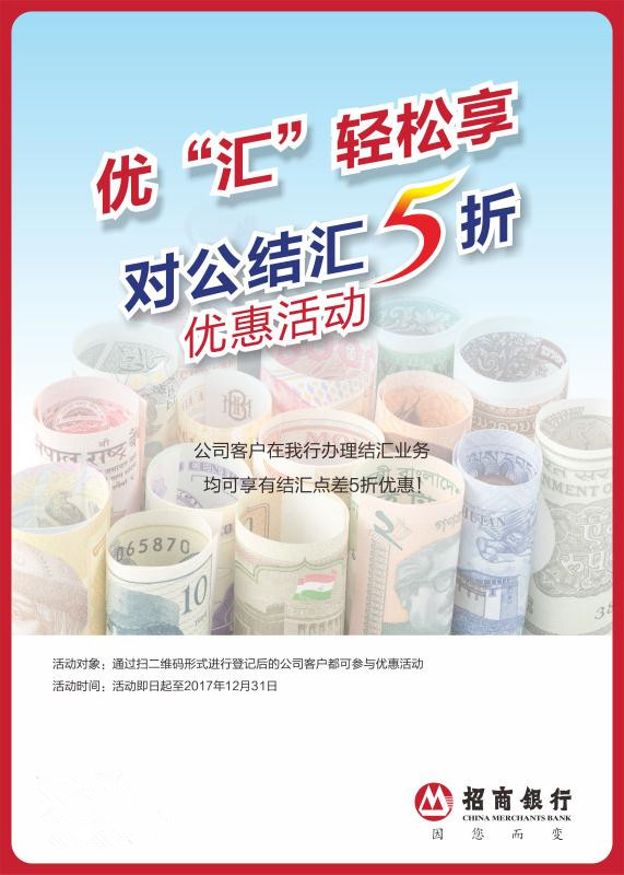 近日,記者從招行深圳分行了解到,自2017年8月1日至2017年年底,招商銀行深圳分行特別推出結(jié)匯尊享優(yōu)惠活動?;顒悠陂g,凡公司客戶,可在招商銀行深圳分行轄內(nèi)(含珠海分行及惠州分行)任一網(wǎng)點(diǎn)通過掃描指定二維碼進(jìn)行登記,登記后辦理結(jié)匯業(yè)務(wù)即可享受結(jié)匯點(diǎn)差五折優(yōu)惠。(張怡)