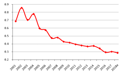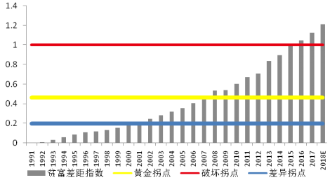 研究發(fā)現(xiàn),貧富差距指數(shù)與經(jīng)濟發(fā)展存在這三個拐點:差異拐點(0.2)、黃金拐點(0.463)及破壞拐點(1)。當貧富差距指數(shù)在0.2以下的低值區(qū)時,絕對平均造成動力不足。當貧富差距指數(shù)高于0.2時,差異的動力效應(yīng)開始顯現(xiàn),貧富差距指數(shù)與GDP增長率存在顯著的倒U型的非線性關(guān)系。而且拐點在貧富差距指數(shù)等于0.463左右,對應(yīng)的時間為2006-2007年之間,貧富差距在這個水平左右對經(jīng)濟增長的動力效應(yīng)最高。當貧富差距指數(shù)低于1時,貧富差距處于合理狀態(tài),合理的貧富差距提高了居民的工作動能,有利于促進經(jīng)濟增長,但超過臨界值1,隨著貧富差距進一步提高,貧窮人口會有日益強烈的被剝削感,在一定程度上抑制了經(jīng)濟總量的提升。據(jù)此,近年來我國貧富差距的演變過程可以分為四大階段,分別是“財富絕對平均階段”(1991-2001年)、“差異帶來動力,逐步接近黃金拐點階段”(2001-2007年)、“貧富差異擴大階段”(2007-2015年)及“貧富分化相對嚴重階段”(2015年至今)。經(jīng)研究團隊測算,2018年貧富差距指數(shù)預(yù)計已超過破壞拐點。