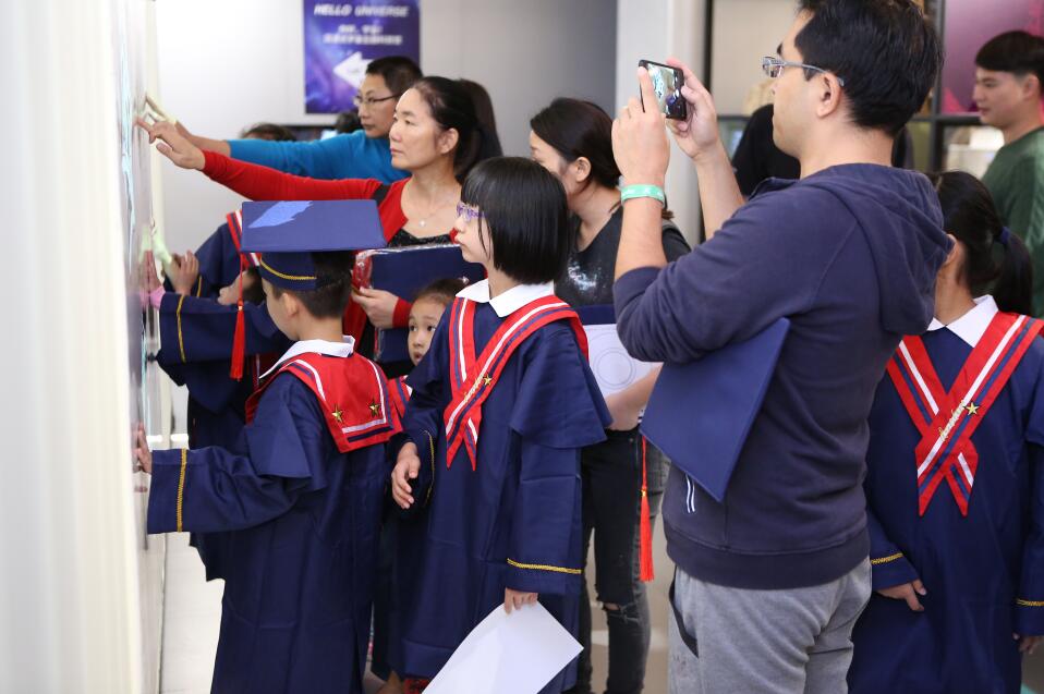 在“登陸銀河系”環(huán)節(jié),小朋友們置身絢麗的“外太空”,他們驚訝的發(fā)現(xiàn),自己與其他小朋友之間,被一束束美麗的粒子流連接在一起,粒子形成的光圈化作點點星光,仿佛在銀河中漫步。“媽媽,我知道,銀河系就是像這樣子扁扁的。”一名小朋友好奇的看著他與母親腳下的粒子束若有所思。