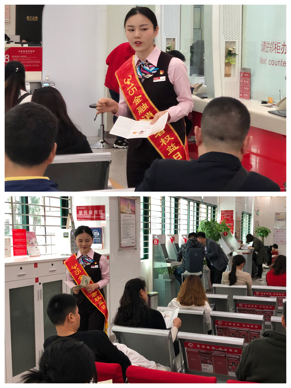 同時(shí)在營(yíng)業(yè)廳積極舉辦微沙龍、金融知識(shí)小講座、互動(dòng)問(wèn)答等,由黨員代表佩戴黨員徽章、亮明身份,擔(dān)任消保宣傳專員,主動(dòng)利用服務(wù)間隙普及金融消費(fèi)者八項(xiàng)權(quán)利,提示金融消費(fèi)者到正規(guī)持牌機(jī)構(gòu)、選擇適當(dāng)?shù)漠a(chǎn)品和服務(wù),并為客戶提供貼心關(guān)懷,送上飲品、零食等。