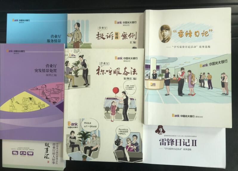 光大銀行深圳分行在組織開展上述活動中發(fā)現(xiàn),一線員工用樸素的文字記述著服務(wù)客戶的點(diǎn)滴事例,詮釋著對優(yōu)質(zhì)服務(wù)的理解和追求,弘揚(yáng)著具有光大特色的家園文化、陽光文化,字里行間飽含著對光大事業(yè)的忠誠和熱愛,看到了員工中蘊(yùn)含著巨大的工作熱情和創(chuàng)造力。為更好鼓勵員工積極性,在深圳分行領(lǐng)導(dǎo)支持下,深圳分行陽光服務(wù)辦每年將員工發(fā)表的案例進(jìn)行認(rèn)真篩選編輯,署上員工姓名,聘請專業(yè)美術(shù)人員配圖插畫,再印制成精美的書籍,供大家日常學(xué)習(xí)和收藏。從2013年開始至2019年的7年間,深圳分行先后將員工發(fā)表的文章案例印制了《廳堂服務(wù)情景案例》、《營業(yè)廳突發(fā)情景處置案例匯編》、《營業(yè)廳好人好事故事匯》、《投訴處理案例》、《稱呼服務(wù)法》、《雷鋒日記-學(xué)寫雷鋒日記活動故事選編》、《雷鋒日記II-學(xué)寫雷鋒日記活動故事選編》共計7本書籍。