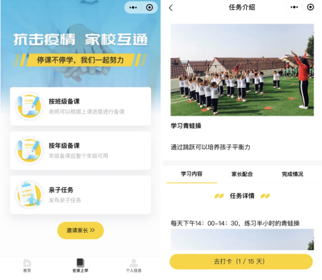 為此,“學子通”上線了“在家上學”功能,老師們可根據(jù)實際需要,選擇“按班級備課”或“按年級備課”,針對班級或年級將錄制好的備課內(nèi)容,如防疫小知識、親子閱讀、親子游戲等內(nèi)容上傳到“在家上學”模塊,讓孩子“宅”在家中也不停止學習的腳步。此外,老師還可通過設置親子小任務,如一起做青蛙操、讀讀繪本小故事和親子手工藝等,讓家長和學生一起參與,并可設置打卡,調(diào)動起學生的學習興趣,既增加親子感情,又讓學生開展室內(nèi)鍛煉活動、開展課外閱讀,保持良好的身體狀態(tài),讓宅在家中的假期生活變得豐富。