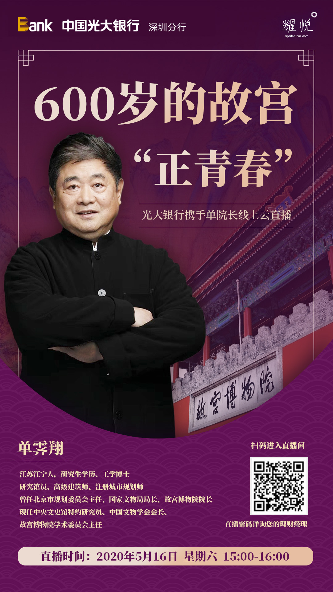 深圳新聞網(wǎng)2020年5月15日訊 他要來了,帶著600歲故宮的青春故事來了,來到《光大銀行“開講啦”!》第十二期。為了回饋客戶,讓廣大客戶更深入體會到故宮之美,光大銀行深圳分行特邀請原故宮博物館單霽翔院長,于5月16日(周六)下午3點-4點線上開講精彩課程《600歲的故宮“正青春”》,讓參與者從多個角度體驗傳統(tǒng)文化之美。
