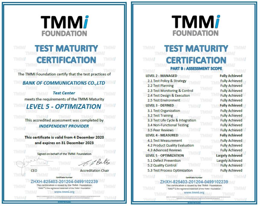 TMMi認證是當前國際上最權(quán)威的測試組織成熟度認證體系,也是軟件產(chǎn)品質(zhì)量管理水平最有力的資質(zhì)證明,最高級別為五級。此次獲得五級認證,標志著交行的軟件測試能力、產(chǎn)品質(zhì)量管理水平、風險應對能力、測試過程改進能力、測試技術創(chuàng)新能力的整體成熟度均已達到國際領先水平。