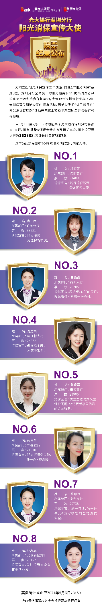 深圳新聞網(wǎng)·見圳客戶端2021年5月8日訊 昨日,光大銀行深圳分行“陽光消保宣傳明星大使”線上投票圓滿結束,從58名宣傳大使中投票產(chǎn)生了賴春妮、肖雨、曹晶晶、周之靖、黃曉霞、蔣易萱、曾粵玲、林思思8名陽光消保宣傳明星大使。明星大使將在5月15日的“陽光消保健康跑”活動開幕式上被授予榮譽勛章并接受行領導授旗。5月1日,光大銀行深圳分行發(fā)起了“陽光消保宣傳明星大使”線上投票,旨在樹立起陽光消保宣傳工作典型,打造“陽光消保”品牌,提升深圳分行全體員工的陽光服務水平,提高消費者風險防范意識和自我保護能力,提升光大在深圳地區(qū)的品牌影響力。投票活動得到社會熱烈響應,據(jù)統(tǒng)計,此次累計票數(shù)達363388次。