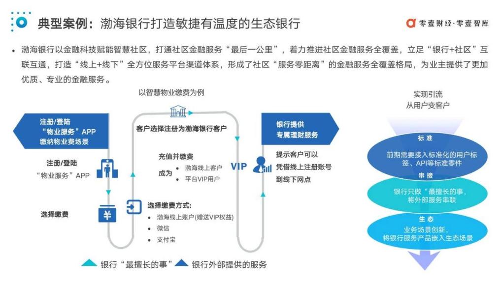 以此次該行入圍行業(yè)權(quán)威報(bào)告的“智慧物業(yè)”金融科技創(chuàng)新服務(wù)項(xiàng)目為例,渤海銀行創(chuàng)新業(yè)務(wù)場(chǎng)景——繳納物業(yè)費(fèi)場(chǎng)景,社區(qū)居民通過“物業(yè)服務(wù)APP”繳納物業(yè)費(fèi)時(shí),可以選擇渤海銀行線上賬戶為付費(fèi)方式,當(dāng)用戶充值并繳費(fèi)后,便同時(shí)成為了渤海銀行線上客戶和平臺(tái)V IP,并享受銀行提供的專屬理財(cái)服務(wù)。通過將自身服務(wù)產(chǎn)品嵌入“物業(yè)服務(wù)”A PP,只做“最擅長(zhǎng)的事,渤海銀行將外部服務(wù)串聯(lián)”,最終實(shí)現(xiàn)A PP用戶到自身客戶的轉(zhuǎn)變。