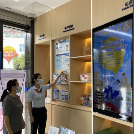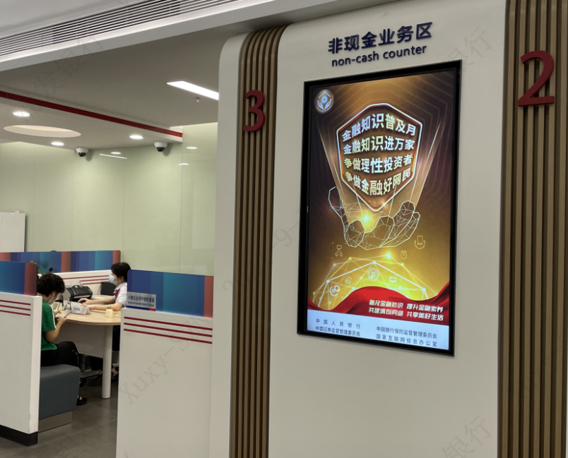 在網(wǎng)點(diǎn)營業(yè)大廳內(nèi),電子屏中的2021年金融知識(shí)普及月海報(bào)營造了良好宣傳氛圍。金融之手,強(qiáng)而有力,各營業(yè)網(wǎng)點(diǎn)一手承接了金融知識(shí)普及多方面的內(nèi)容,共同構(gòu)建了線上線下、電信、網(wǎng)絡(luò)等多渠道傳播的金融知識(shí)普及傳播網(wǎng),有力推進(jìn),勢在必行。