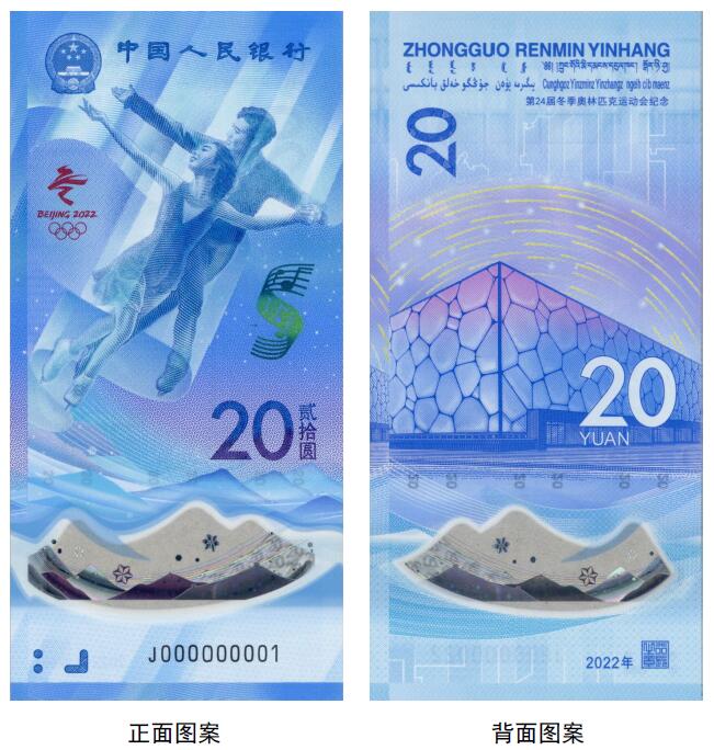 正面圖案:正面主景為花樣滑冰運動員圖案,上方為中華人民共和國國徽、“中國人民銀行”行名,左側為第24屆冬季奧林匹克運動會會徽,右側為光彩光變樂譜圖案、面額數(shù)字“20”與漢字“貳拾圓”,下方為動感全息圖案、透明視窗、盲文面額標記和冠字號碼。