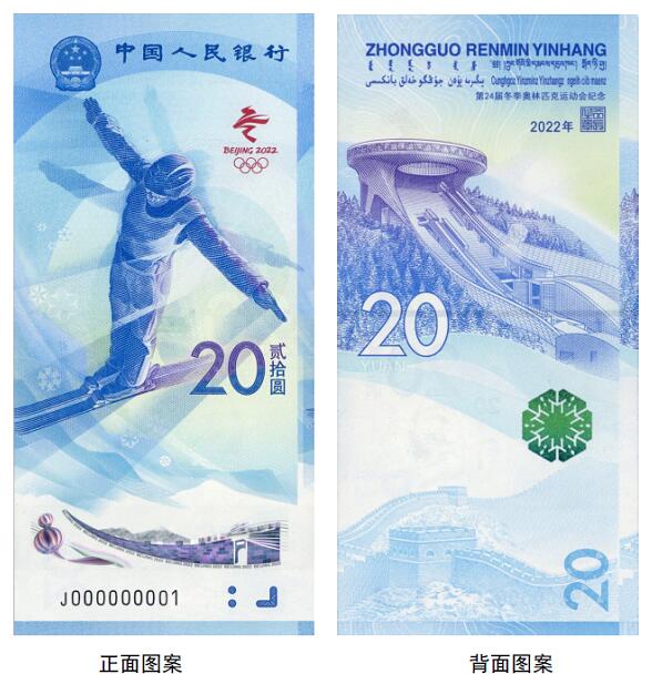 正面圖案:正面主景為自由式滑雪運動員圖案,上方為中華人民共和國國徽、“中國人民銀行”行名,右側為第24屆冬季奧林匹克運動會會徽、面額數(shù)字“20”與漢字“貳拾圓”,下方為動感全息圖案、盲文面額標記和冠字號碼。