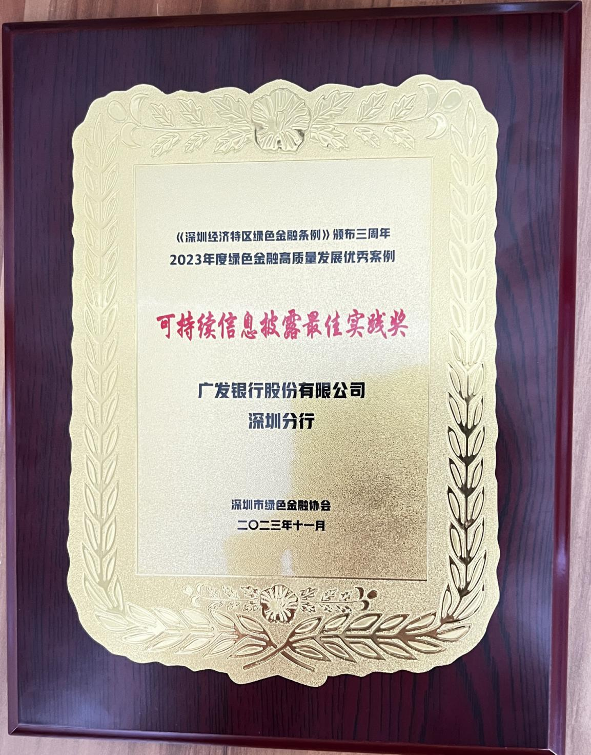深圳新聞網(wǎng)2023年11月30日訊(記者 朱琳 通訊員 李華鳳)近日,深圳市綠色金融協(xié)會(huì)組織開展“2023年綠色金融高質(zhì)量發(fā)展優(yōu)秀案例評(píng)選”活動(dòng),表彰貫徹落實(shí)《深圳經(jīng)濟(jì)特區(qū)綠色金融條例》、推動(dòng)綠色金融發(fā)展的最佳實(shí)踐,以榜樣力量引領(lǐng)綠色金融高質(zhì)量發(fā)展的典型。廣發(fā)銀行深圳分行榮獲“可持續(xù)信息披露最佳實(shí)踐獎(jiǎng)”。