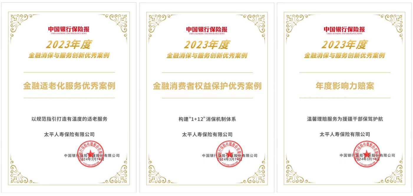 深圳新聞網(wǎng)2024年3月15日訊(記者 朱琳 通訊員 宋超群)3月14日,由《中國銀行保險(xiǎn)報(bào)》主辦的2024金融消保與服務(wù)創(chuàng)新主題活動(dòng)在京舉辦,現(xiàn)場公布了2023年度金融消保與服務(wù)創(chuàng)新優(yōu)秀案例名單,太平人壽三項(xiàng)案例榜上有名,分別入選金融適老化服務(wù)優(yōu)秀案例、年度影響力理賠案例、消費(fèi)者權(quán)益保護(hù)優(yōu)秀案例。