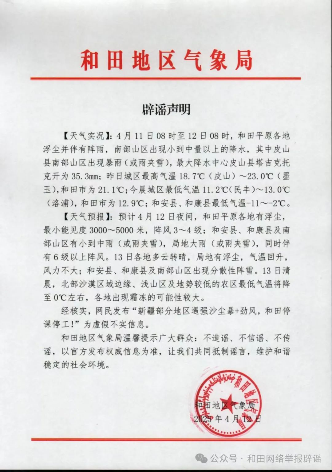 經和田地區(qū)氣象局核實,網傳信息系謠言。