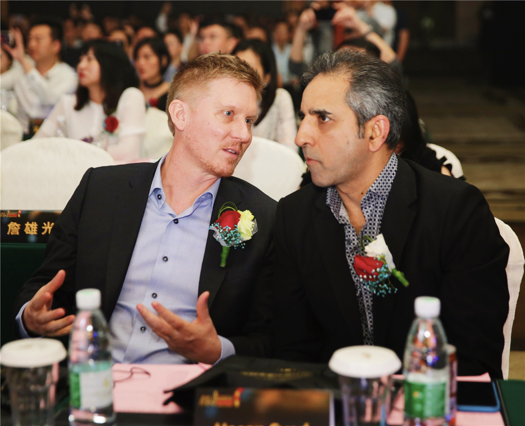 △中央美術(shù)學(xué)院建筑設(shè)計(jì)研究院院長、博士生導(dǎo)師王鐵,美國Gensler上海公司總監(jiān)Hasan Syed為廣州設(shè)計(jì)師黃永才頒發(fā)“最佳娛樂空間設(shè)計(jì)獎(jiǎng)”