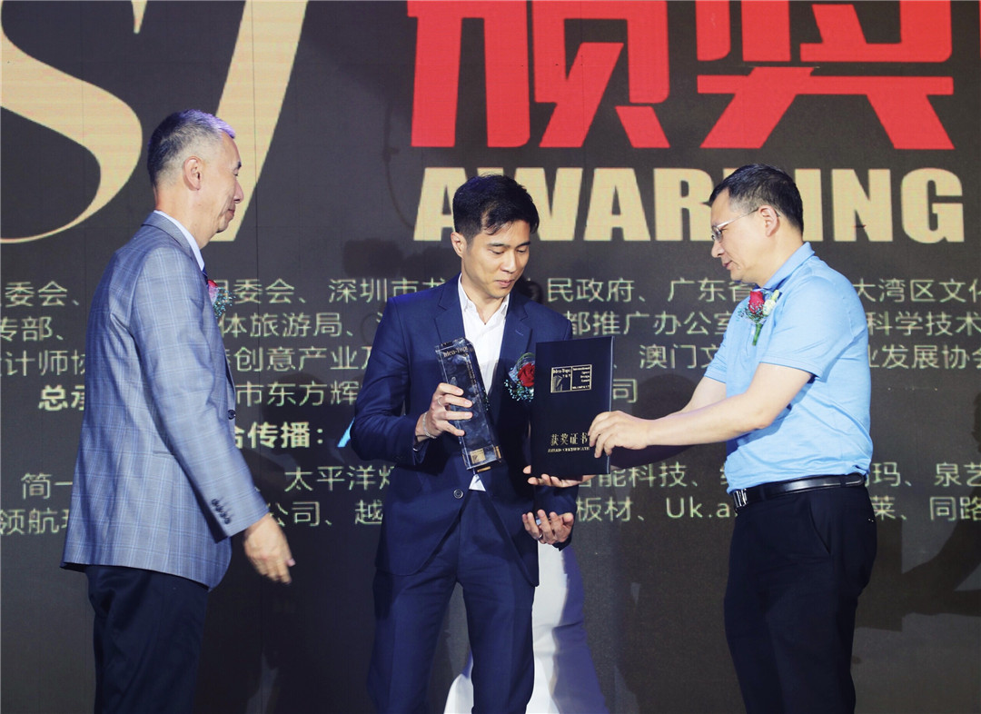△深圳市政協(xié)提案委員會(huì)副巡視員魏威與清華大學(xué)美術(shù)學(xué)院博士生導(dǎo)師張?jiān)?、為上海黑泡泡建筑裝飾設(shè)計(jì)工程有限公司設(shè)計(jì)師代表頒發(fā)“最佳會(huì)所設(shè)計(jì)獎(jiǎng)”