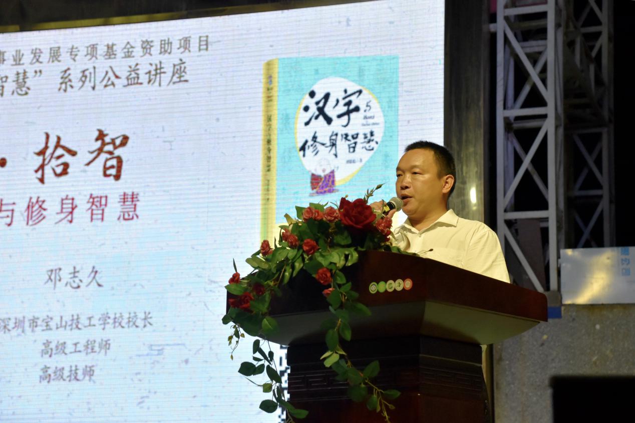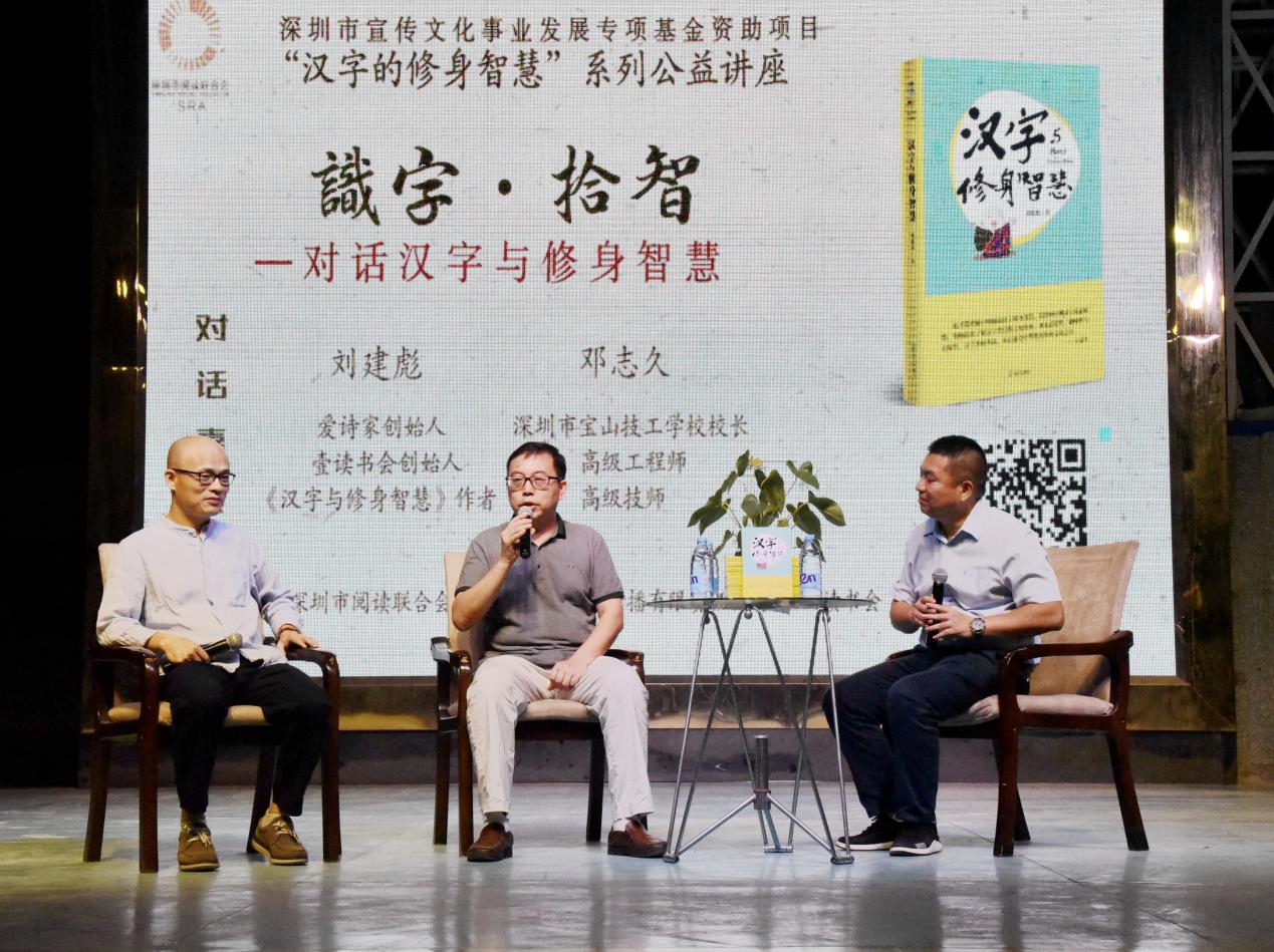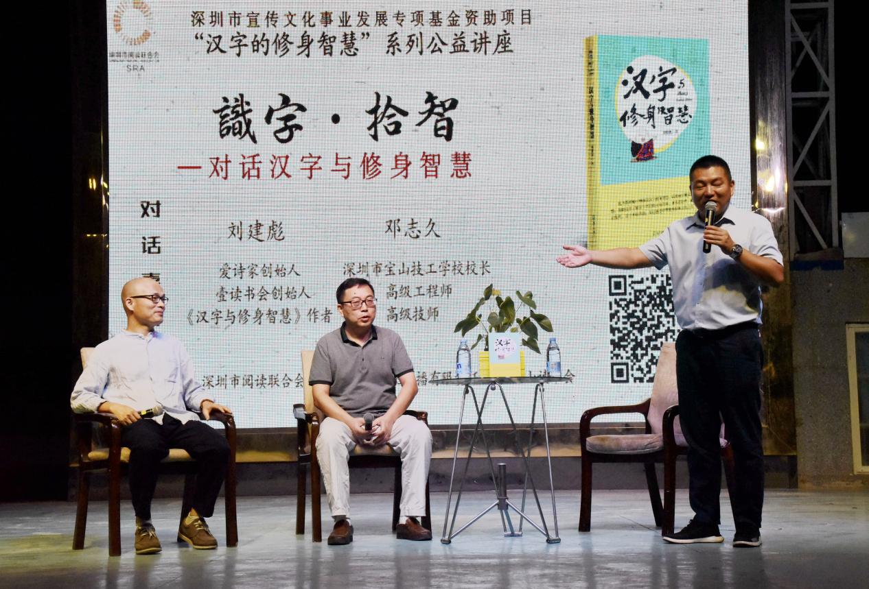 深圳新聞網(wǎng)訊 9月18日晚上7時(shí),由深圳市閱讀聯(lián)合會(huì)、深圳市壹書文化傳播有限責(zé)任公司和寶山讀書會(huì)共同主辦的“‘識(shí)字拾智’——對(duì)話漢字與修身智慧”公益文化講座在寶山技工學(xué)校寶山大舞臺(tái)拉開了序幕。據(jù)悉,這是由深圳市宣傳文化事業(yè)發(fā)展專項(xiàng)基金資助項(xiàng)目“漢字的修身智慧”的第三場(chǎng)公益文化講座,以劉建彪《漢字與修身智慧》新書分享為契機(jī),傳播漢字正能量,讓更多的青少年識(shí)字長(zhǎng)智,領(lǐng)略漢字文化之精妙。