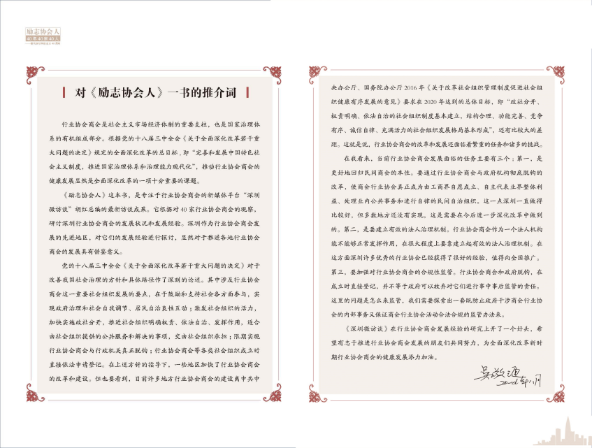 在《勵(lì)志協(xié)會人》40年40家40人的編著過程中,得到社會各界的關(guān)注、支持和高度肯定, 著名的經(jīng)濟(jì)學(xué)家吳敬璉說《勵(lì)志協(xié)會人》研討了深圳行業(yè)協(xié)會商會的發(fā)展?fàn)顩r和發(fā)展經(jīng)驗(yàn)。深圳微訪談在行業(yè)協(xié)會商會發(fā)展經(jīng)驗(yàn)的研究上開了一個(gè)好頭,希望有志于推進(jìn)行業(yè)協(xié)會商會發(fā)展的朋友們共同努力,為全面深化改革新時(shí)期行業(yè)協(xié)會商會的健康發(fā)展添力加油。