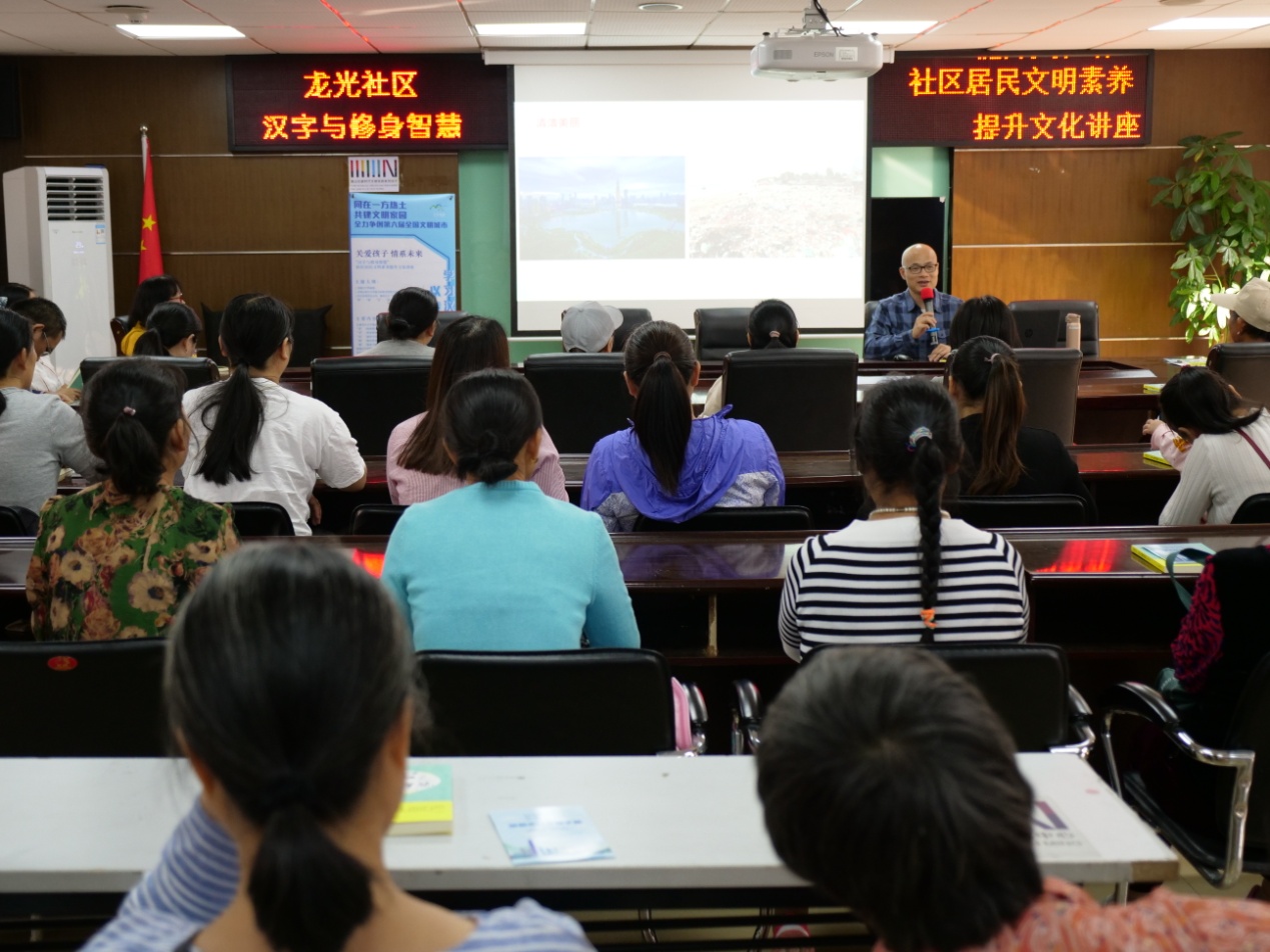 深圳新聞網(wǎng)訊 為更一步提升社區(qū)居民文化素養(yǎng),推動社區(qū)創(chuàng)建第六屆全國文明城市工作邁上新的臺階,11月19日下午,龍光社區(qū)工作站組織社區(qū)居民參加“‘漢字與修身智慧’社區(qū)居民文明素養(yǎng)提升”文化講座,邀請壹讀書會創(chuàng)始人、知名閱讀推廣人、《漢字與修身智慧》的作者劉建彪擔任主講嘉賓,從中華文明的基因(漢字)出發(fā),解讀深圳市民公約,旨在啟發(fā)居民在中華優(yōu)秀傳統(tǒng)文化的感召之下,踐行文明禮儀,用實際行動去推進文明城市的創(chuàng)建。