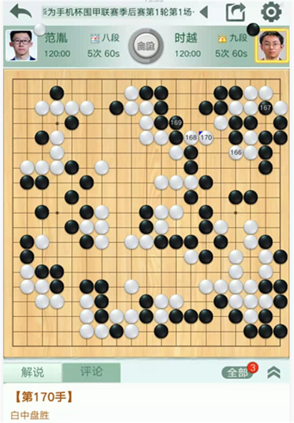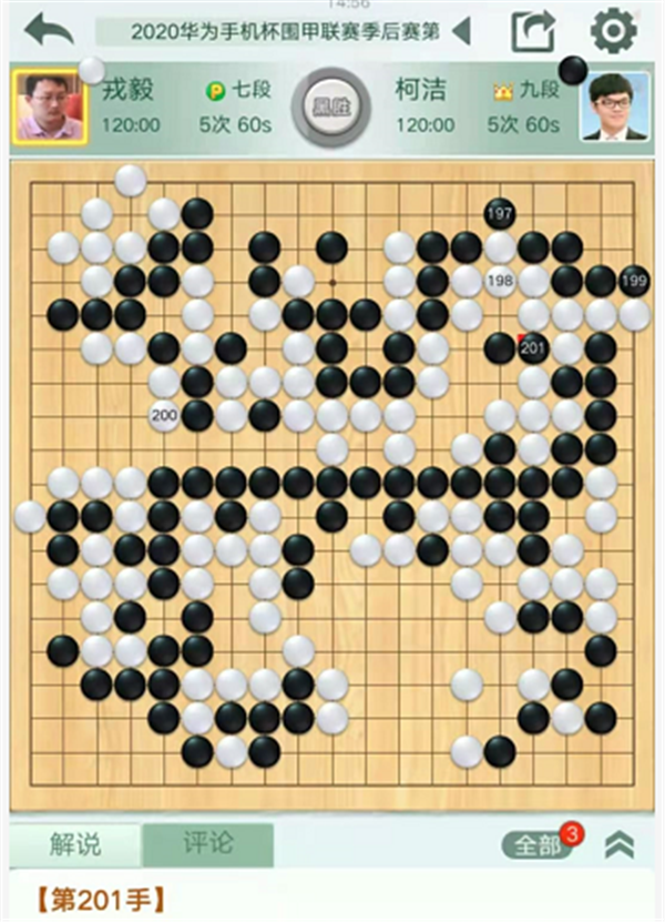 第三臺(tái)慢棋,由深圳隊(duì)的戎毅七段執(zhí)白對(duì)陣民生隊(duì)的柯潔九段。戎毅執(zhí)白對(duì)陣柯潔。開(kāi)局左下變化新穎,白棋略有所得。之后右下角戰(zhàn)斗形成轉(zhuǎn)換,局面依然白好。右邊戰(zhàn)斗中黑棋形狀處理失誤,白棋簡(jiǎn)單整形將是大優(yōu)勢(shì)局面,但是白棋選擇了復(fù)雜的殺黑大龍的變化。最后白棋選擇和黑棋互相分?jǐn)鄬?duì)殺的話,將是白棋正好不行,實(shí)戰(zhàn)不得不放黑棋大龍連回后,白棋敗勢(shì)。最終戎毅執(zhí)白中盤負(fù)柯潔。