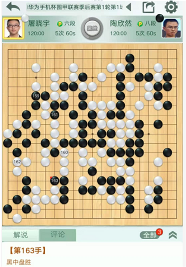 第四臺(tái)慢棋,由深圳隊(duì)陶欣然八段執(zhí)黑對(duì)陣民生隊(duì)的屠曉宇六段。開(kāi)局雙方互圍大模樣。白棋右邊在黑空試應(yīng)手時(shí)黑方強(qiáng)烈反擊。白棋沒(méi)有下出做活的手段,不得不付出很大代價(jià)出頭跑出,黑優(yōu)勢(shì)。之后中央白棋混戰(zhàn)中戰(zhàn)略方向錯(cuò)誤,黑棋優(yōu)勢(shì)擴(kuò)大。最后黑棋在左邊白棋空里薄弱處出棋,一舉獲勝。陶欣然執(zhí)黑中盤勝屠曉宇。