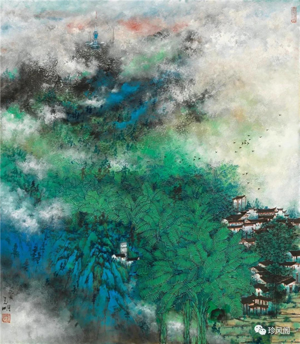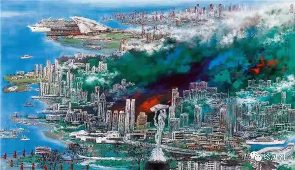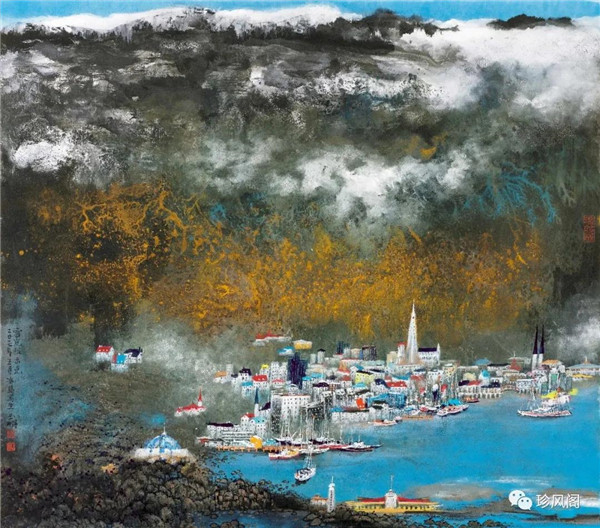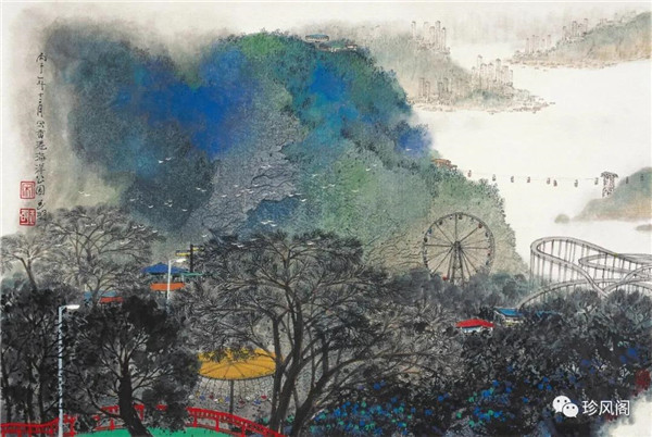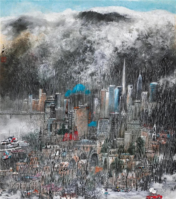 宋玉明從金陵畫(huà)派的新傳統(tǒng)跨越到城市表現(xiàn)的積彩拓墨畫(huà)法,既體現(xiàn)了現(xiàn)代化城市對(duì)于變革傳統(tǒng)的時(shí)代訴求,也體現(xiàn)了他移居深圳后這座新興城市文化對(duì)于他的深刻影響。畢竟,連續(xù)數(shù)屆的深圳水墨雙年展對(duì)于水墨在跨文化中重要作用與表現(xiàn)方法的突破,都給予他至深的思想開(kāi)拓。這表明,城市山水畫(huà)已不單純是用中國(guó)畫(huà)表現(xiàn)城市的命題,而是其中能夠蘊(yùn)含多少城市文化觀念與城市審美的方法,宋玉明對(duì)于城市山水畫(huà)的探索,體現(xiàn)的正是這樣一種對(duì)城市現(xiàn)代文化的思想融合性。而不拘謹(jǐn)于城市一磚一石、一街一道、一房一樓的描繪,著眼于發(fā)揮水墨與彩墨表現(xiàn)的自由性,抑或體現(xiàn)了人性、自然與現(xiàn)代城市共同作用的現(xiàn)代生活方式與人文理想。的確,純粹用中國(guó)畫(huà)或水墨畫(huà)來(lái)探索城市的現(xiàn)代化景觀表現(xiàn),也許只是淺層次的審美需求;而只有當(dāng)把山水畫(huà)作為人與自然和諧統(tǒng)一的觀念表達(dá)植入城市現(xiàn)代化的審美訴求時(shí),城市山水畫(huà)才能真正凸顯出其深刻的美學(xué)價(jià)值。這正是我們從宋玉明的作品里能夠讀解到的他對(duì)于城市山水畫(huà)審美理想的一種勾畫(huà)。