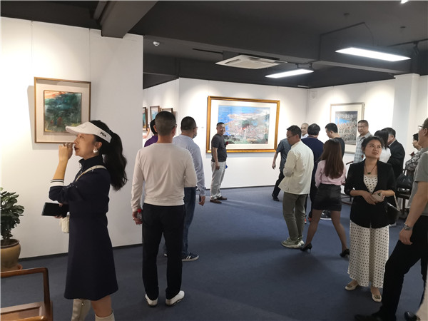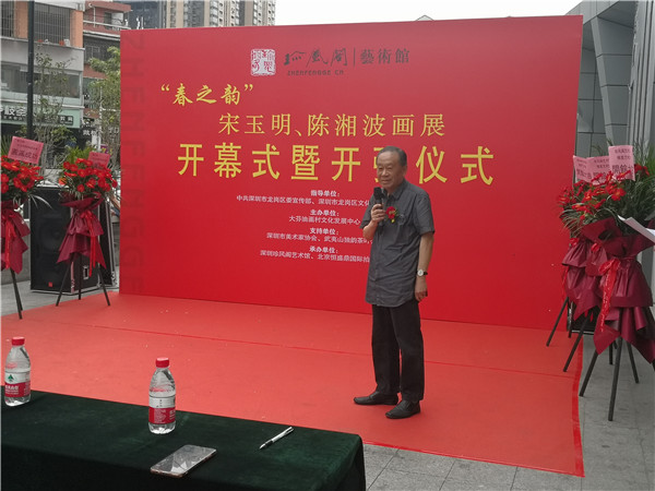 開(kāi)幕儀式上,珍風(fēng)閣藝術(shù)館總經(jīng)理夏雨致辭,感謝一從嘉賓和書(shū)畫(huà)愛(ài)好者們的捧場(chǎng)。隨后,深圳市美術(shù)家協(xié)會(huì)名譽(yù)主席、深圳美術(shù)館原館長(zhǎng)宋玉明先生致辭。他說(shuō),他來(lái)大芬村多次,一直關(guān)注大芬油畫(huà)村的發(fā)展和壯大,認(rèn)為大芬村為全國(guó)書(shū)畫(huà)走向市場(chǎng)開(kāi)了先例。個(gè)人在此舉辦畫(huà)展是首次,感覺(jué)很有意義,是一次走向市場(chǎng)的實(shí)踐機(jī)會(huì),值得珍惜和學(xué)習(xí),也歡迎大家批評(píng)指正。在現(xiàn)場(chǎng),宋玉明老師還回答了主持人的提問(wèn)。他謙虛地說(shuō),這次和陳湘波主席的聯(lián)展,有陳主席的花鳥(niǎo)和自己的城市山水,可以雅俗共賞。陳湘波老師因參加“兩會(huì)”未能出席開(kāi)幕儀式,但在會(huì)后及時(shí)趕到現(xiàn)場(chǎng),表達(dá)自己對(duì)來(lái)賓的感謝和自己對(duì)本次畫(huà)展組織的重視和支持。