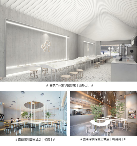 店中的桌子做成浮云形狀,山成為桌子的一部分,與天頂?shù)纳叫伟咨⌒雾斉镞b相呼應(yīng),“山外山”主題呼之欲出。喜茶·山外山的設(shè)計(jì)靈感來(lái)源于兩幅古畫(huà)——《春山瑞松圖》和《溪山行旅》。設(shè)計(jì)師把畫(huà)中的“山峰”感融入店內(nèi),現(xiàn)代化的同時(shí)富有詩(shī)意。讓茶客仿佛置身畫(huà)中,大夢(mèng)一場(chǎng),不知身在何方。
