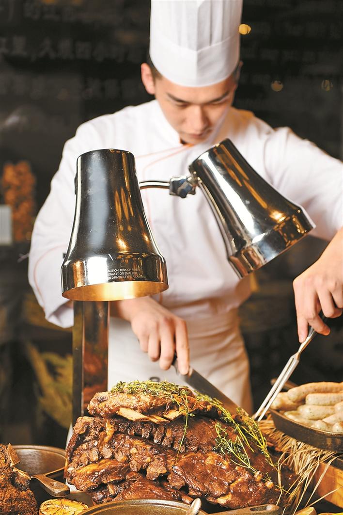 周五至周日則是熱情的“燃”主題自助晚餐。沙威瑪烤肉、T骨牛扒、意式烤豬肉卷、德國香腸以及德國堿水面包,酒店主廚做了最簡單的處理,將肉質(zhì)最鮮美的味道保留下來,再以520華攝氏度將美味繼續(xù)升溫。鮮咖啡餐廳位于酒店一層,環(huán)境優(yōu)雅舒適,全天候開放,供應(yīng)各式散點菜品和自助餐,設(shè)有開發(fā)式廚房,廚師當(dāng)場展示廚藝,炮制環(huán)球特色佳肴。(張璇)