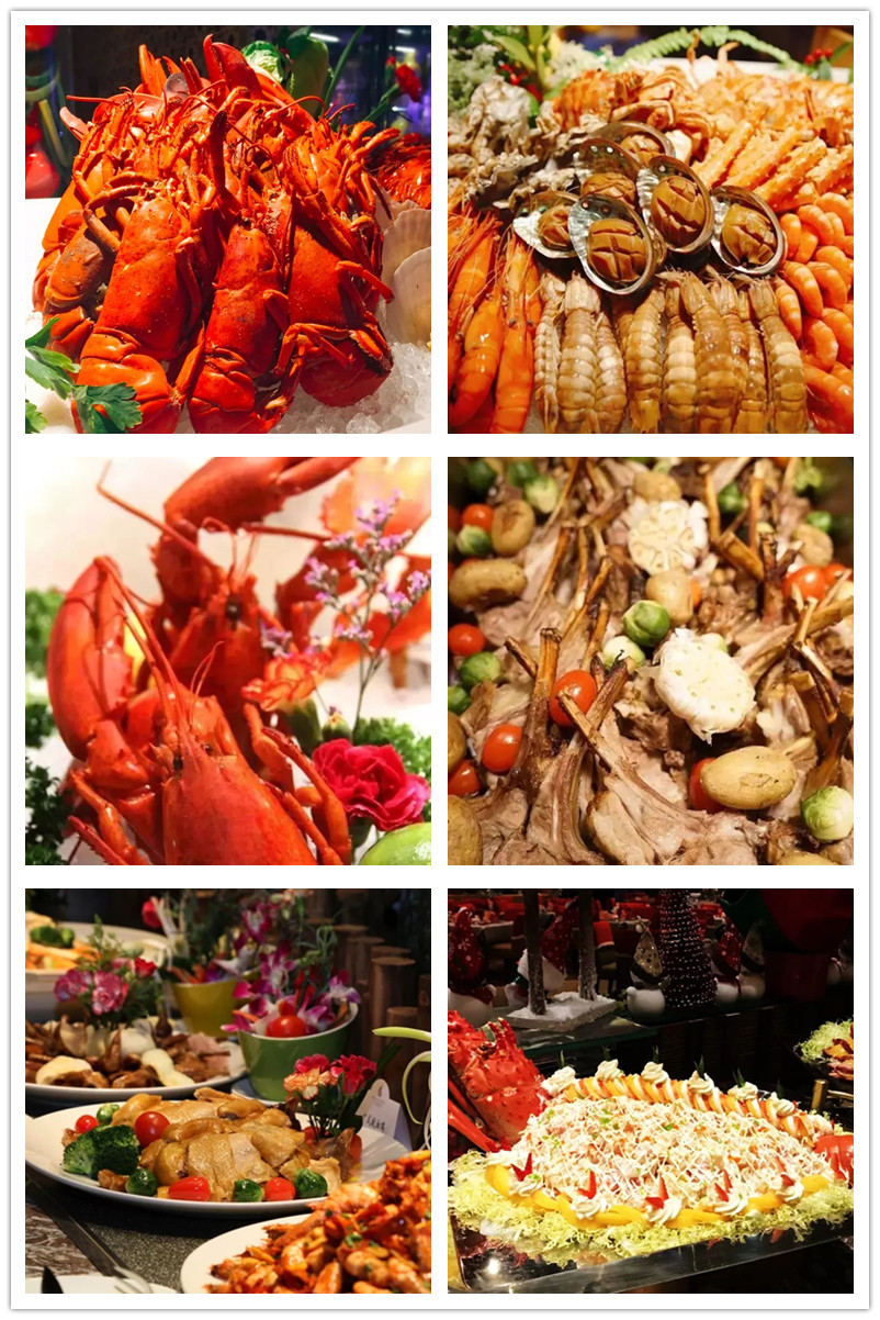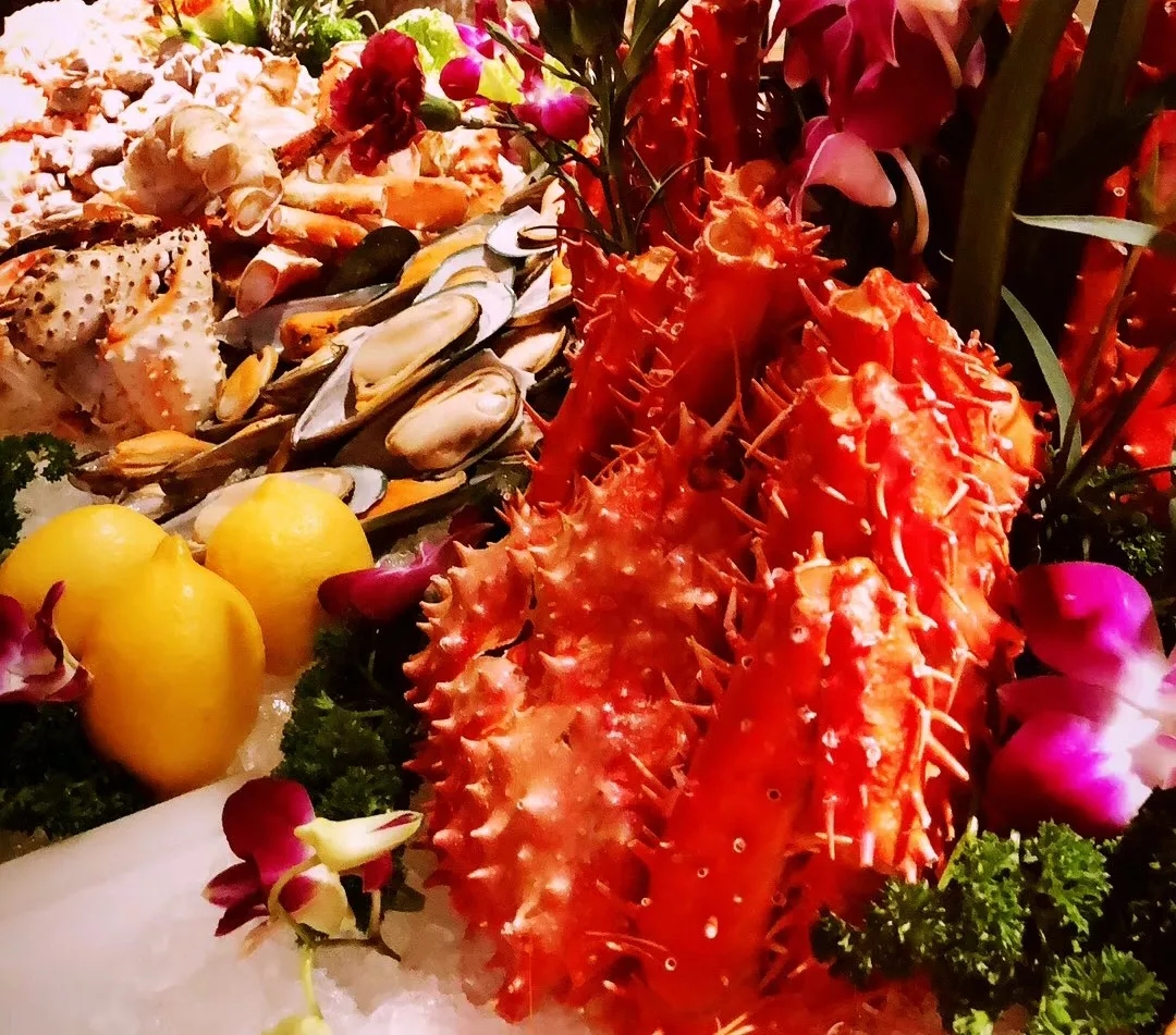 生猛龍蝦、阿拉斯加蟹腳、九節(jié)蝦、三文魚刺身