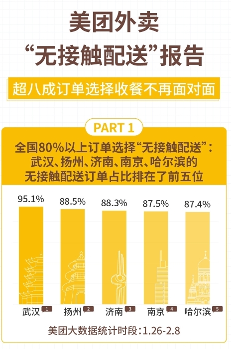 報(bào)告顯示,在1月26日至2月8日期間,在使用“無接觸配送”服務(wù)占比最高的城市中,武漢、揚(yáng)州、濟(jì)南、南京、哈爾濱排在了前五位。從用餐人數(shù)來看,2人份及以上餐食占總體訂單的比例相比較平時(shí)增長了31.7%。采用“無接觸配送”的訂單占到了整體單量的80%以上,且每一單外賣都使用“無接觸配送”服務(wù)的用戶占到66%。
