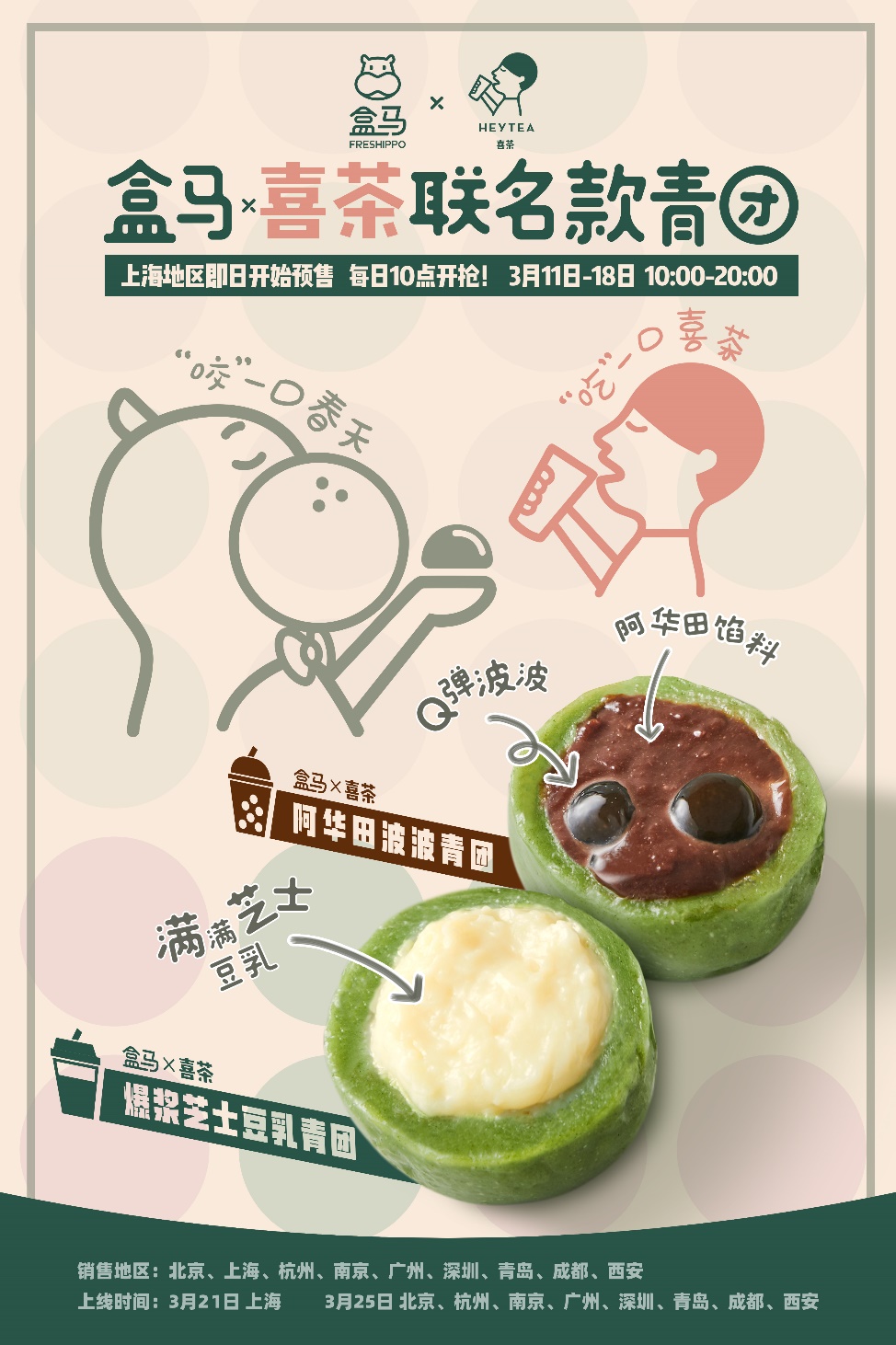 據(jù)了解,盒馬×喜茶聯(lián)名青團于3月11日開啟上海地區(qū)的預售,3月21日將正式上線。北京、杭州、南京、廣州、深圳、青島、成都、西安等地將于3月25日上線,屆時消費者可通過盒馬線上下單,30分鐘就能吃上春天的味道。