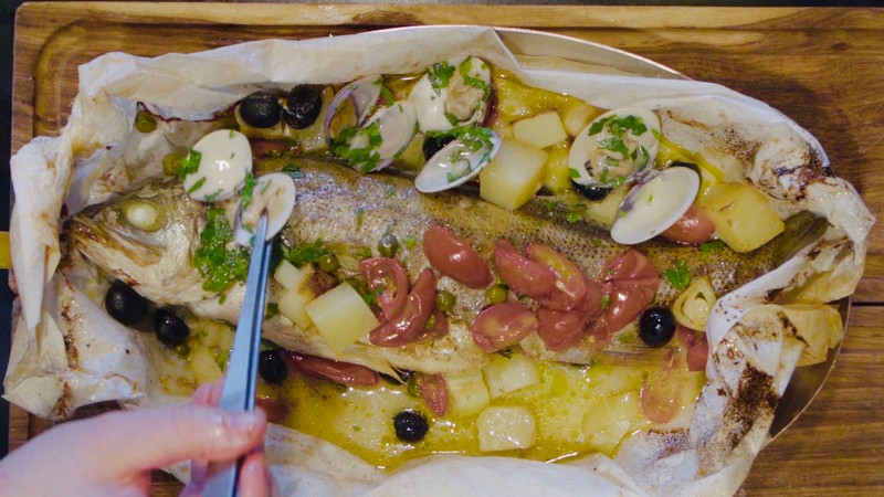 清蒸鱸魚(yú)是常見(jiàn)的粵式吃法,本期,四季酒店主廚畢柏克為吃貨們帶來(lái)別樣的鱸魚(yú)吃法——“烤紙包鱸魚(yú)”。他將魚(yú)進(jìn)行腌制后,用烘焙用紙裹緊,在烤爐中烤制40分鐘。吸收了海鮮文蛤、白葡萄酒精華的魚(yú)肉緊實(shí)鮮嫩,在打開(kāi)外包紙的那一刻,香氣四溢,讓人欲罷不能。如此烹法,也能最大限度保存魚(yú)的營(yíng)養(yǎng)和鮮美。
