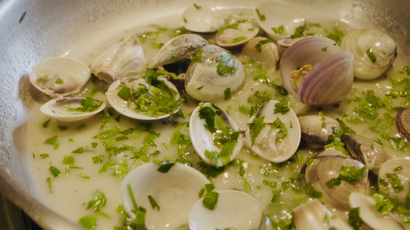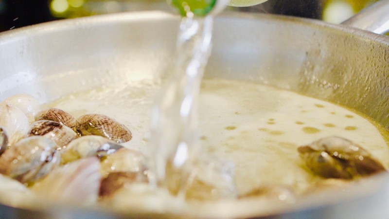 6、在平底鍋中加入適量橄欖油,一邊翻炒大蒜瓣和文蛤,一邊加入白葡萄酒。待文蛤開(kāi)殼后,加入檸檬汁以及歐芹,繼續(xù)烹煮。待熟后,撈起備用;