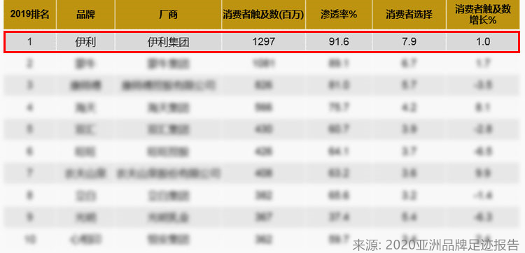 見圳客戶端·深圳新聞網(wǎng)2020年6月23日訊 日前,凱度消費(fèi)者指數(shù)發(fā)布了《2020亞洲品牌足跡報(bào)告》。伊利憑借91.6%的品牌滲透率、近13億的消費(fèi)者觸及數(shù)和近8次的購買頻次,連續(xù)五年位列中國市場消費(fèi)者選擇最多的品牌榜首。綜合報(bào)告數(shù)據(jù)顯示,伊利各項(xiàng)指標(biāo)在榜單中領(lǐng)先于其他品牌,持續(xù)領(lǐng)跑中國快消品市場。