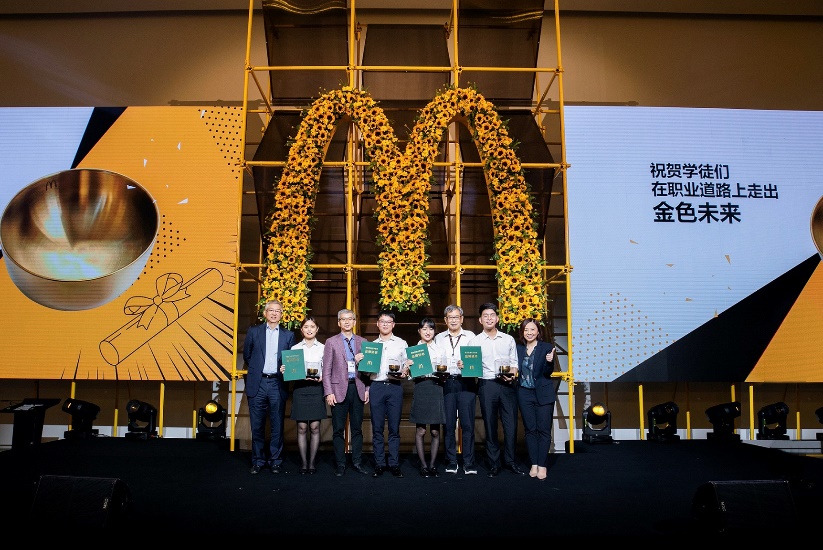 麥當勞領(lǐng)導們、陳李翔和陳宇向四位首批畢業(yè)生代表贈送“出師證”和金碗,并向未來學徒發(fā)出邀請