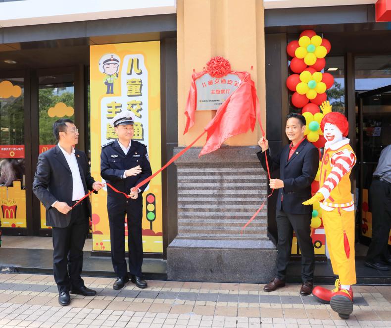 深圳市交警局、福田區(qū)香蜜湖街道辦、深圳麥當(dāng)勞領(lǐng)導(dǎo)與麥當(dāng)勞首席快樂官麥當(dāng)勞叔叔共同為全國(guó)首家麥當(dāng)勞兒童交通安全主題餐廳揭牌
