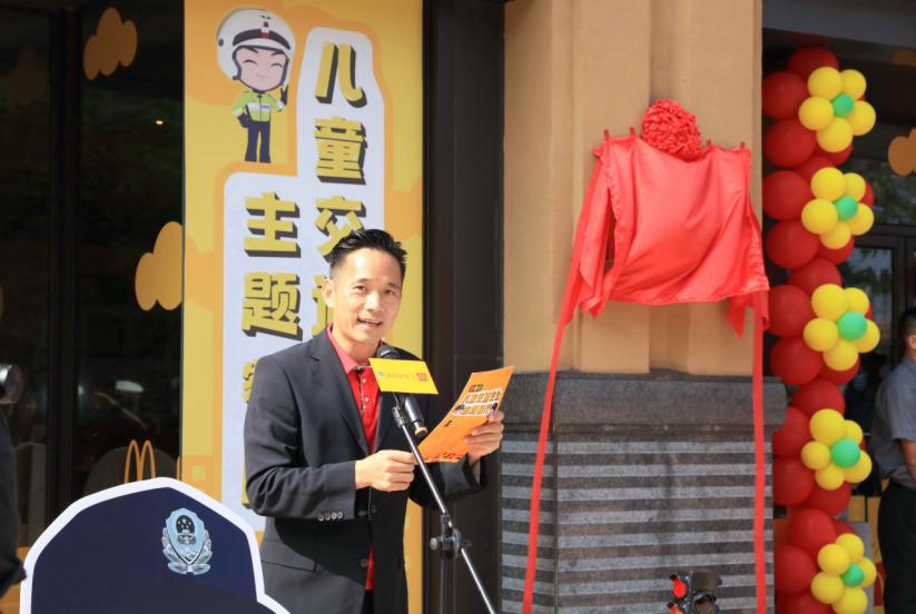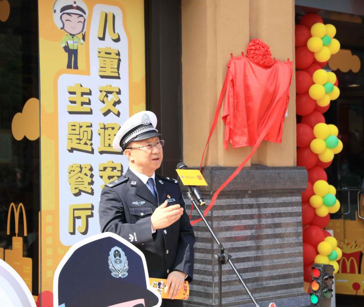 全國(guó)首家麥當(dāng)勞兒童交通安全主題餐廳(深圳市福田區(qū)東海城市廣場(chǎng)餐廳)啟動(dòng)儀式上,深圳市交警局副局長(zhǎng)馮新毅致辭