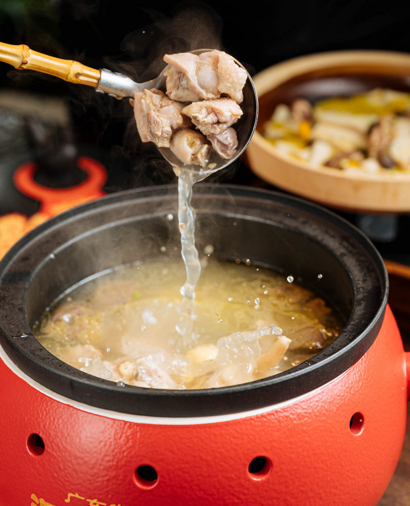 以雞為主要烹飪食材,洞庭土雞館的湖南師傅創(chuàng)造出了不一樣的菜肴。每桌食客坐下,都少不得一碗暖乎乎的洞庭土雞湯來“開場”。它的登場也相當有氣勢,長沙紅磚窯特別定制的大湯鍋,內膽是紫砂構造,這樣的設計既是出于美觀,又是出于更長時間更有效保溫的效果。俗話說得好,工欲善其事必先利其器。土雞方面,師傅特別精選了湖南竹山雞,肉質的彈性略勝一籌,據(jù)介紹,竹山雞的養(yǎng)殖戶開放了大片山頭讓雞跑,放養(yǎng)時間足夠長,達到一年多,在如今快節(jié)奏的社會里已實屬難得。老雞加山泉水文火熬3個小時,并沒有其他的味道干擾,簡簡單單就是本味。