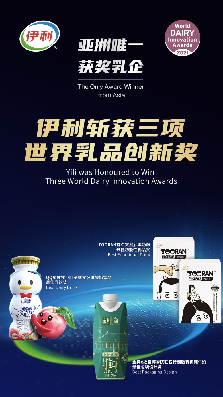 作為全球乳業(yè)的創(chuàng)新風(fēng)向標(biāo),世界乳品創(chuàng)新獎(jiǎng)?wù)故玖巳蛉槠笤趧?chuàng)新方面取得的重要成果,本屆共有來(lái)自25個(gè)國(guó)家、20個(gè)類別的222個(gè)作品參賽。憑借領(lǐng)先的創(chuàng)新實(shí)力,伊利旗下產(chǎn)品獲得三項(xiàng)大獎(jiǎng):QQ星揉揉小肚子膳食纖維酸奶飲品獲得最佳乳飲獎(jiǎng)、「TOORAN有點(diǎn)突然」黑奶粉獲得最佳功能性乳品獎(jiǎng)、金典x故宮博物院聯(lián)名特別版有機(jī)純牛奶獲得最佳包裝設(shè)計(jì)獎(jiǎng)。