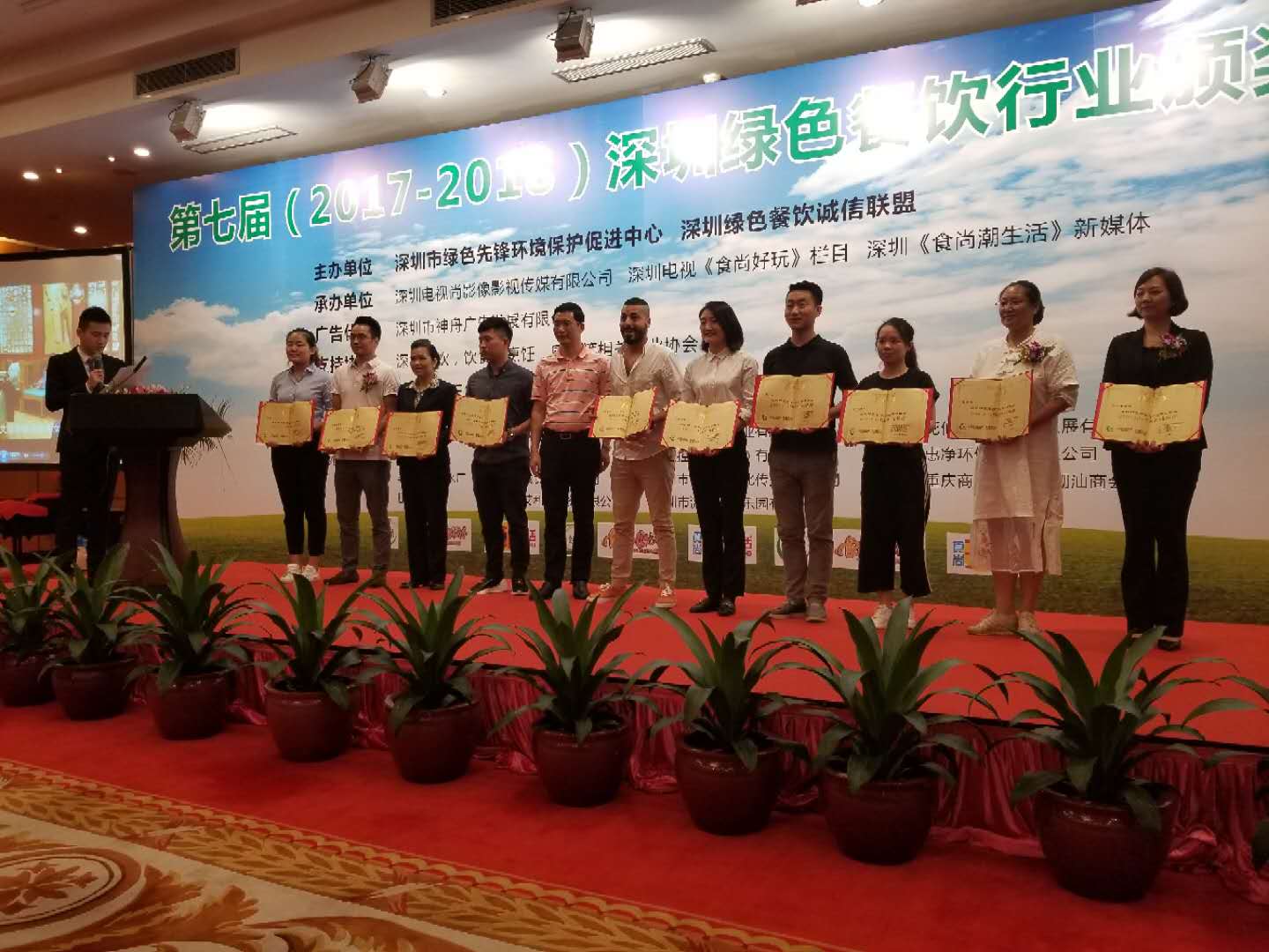 9月19日,第七屆深圳綠色餐飲行業(yè)頒獎典禮在深圳市五洲賓館舉行,共有四十家餐飲企業(yè)分別獲得深圳綠色餐飲十大特色優(yōu)秀名店獎、深圳綠色餐飲十佳綠色誠信企業(yè)獎、深圳綠色餐飲十強連鎖品牌企業(yè)獎、深圳綠色餐飲特受歡迎時尚餐廳獎,十位餐飲行業(yè)杰出代表獲得深圳綠色餐飲十佳人物貢獻獎。