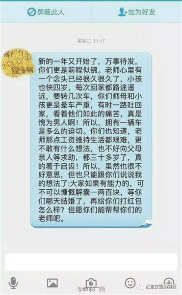 爆料帖中同時上傳了多張聊天記錄,其中一張顯示:“新的一年又開始了,萬事待發(fā),你們更是前程似錦。老師心里有個念頭已經(jīng)很久了,小孩也快四歲了,每次回家都路途遙遠,要轉(zhuǎn)幾次車,你們師母和小孩更是暈車嚴重,有時一路吐回家,看看他們?nèi)绱送纯啵媸抢槟腥税。∷?,擁有一輛車是多么的迫切。你們也知道老師那些工資維持生活都很艱難,更不敢有什么想法,也不好向父母親人求助,都三十多歲了,真的羞于啟齒!所以,雖然也很不好意思,但是也只能跟你們說說我的想法了:大家如果有能力的,可不可以慷慨解囊一兩百塊,等你們哪天結(jié)婚了,再給你們打紅包怎么樣?但愿你們能幫幫你們的老師吧?!?/p>
