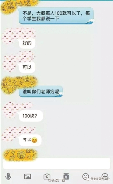 在被曝光的聊天記錄中,該老師曾表示,“大概每人100就可以了,每個學生我都說一下?!辈⒔忉屨f,“誰叫你們老師窮呢?”聊天記錄顯示,群內(nèi)多名學生回復稱,“可以。”